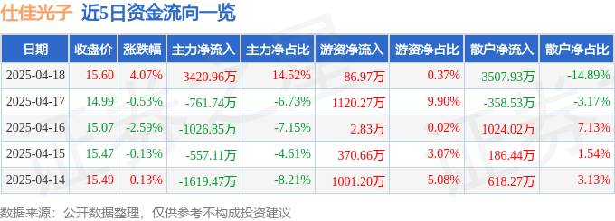 证券之星消息,截至2025年4月18日收盘,仕佳光子(688313)报收于15.6元,上涨4.07%,换手率3.31%,成交量15.19万手,成交额2.36亿元。