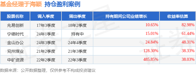于海颖管理的交银增利增强债券A基金在17年3季度买入兆易创新,在持有3个季度后在18年2季度卖出。持有期间的估算收益率为82.98%,持有期间兆易创新在2017年到2018年的年报营业总收入增幅达10.65%。