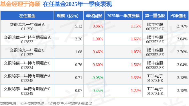 证券之星消息,截止2025年一季度末,基金经理于海颖旗下共管理6只基金,本季度表现最佳的为交银鸿信一年持有期混合A(012833),季度净值涨1.66%。