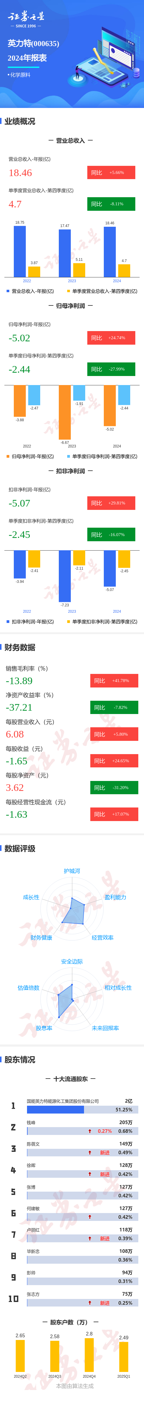 证券之星消息,英力特2024年年报显示,公司主营收入18.46亿元,同比上升5.66%;归母净利润-5.03亿元,同比上升24.74%;扣非净利润-5.08亿元,同比上升29.82%;其中2024年第四季度,公司单季度主营收入4.7亿元,同比下降8.11%;单季度归母净利润-2.45亿元,同比下降28.0%;单季度扣非净利润-2.45亿元,同比下降16.08%;负债率57.23%,投资收益78.77万元,财务费用1298.35万元,毛利率-13.89%。
