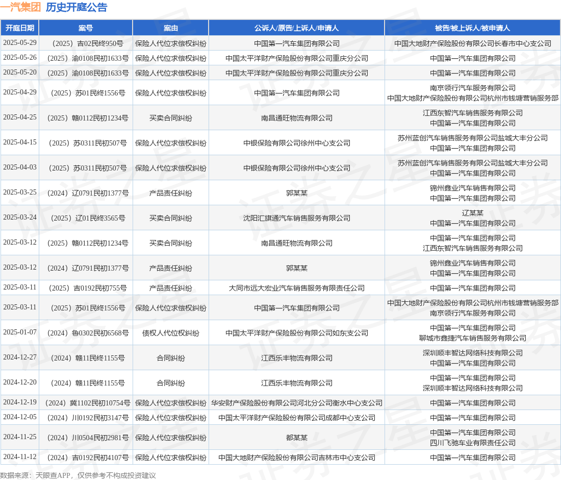 案号:(2025)苏01民终1556号根据统计,近一年内以中国第一汽车集团有限公司为当事人的历史开庭公告有45则,其中案由为“保险人代位求偿权纠纷”的公告以15则居首,其次为“买卖合同纠纷”有9则,“产品责任纠纷”有5则。历史开庭公告(前20条)如下: