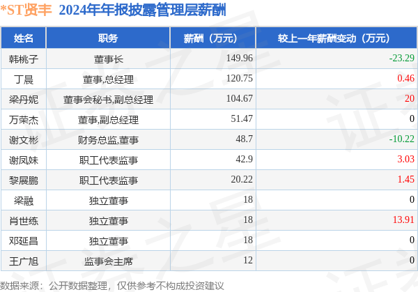 证券之星消息,*ST贤丰发布2024年年报,数据显示:公司主营收入4.4亿元,同比增400.31%。归母净利润为-1.13亿元,同比增5.92%。扣非净利润为-1.31亿元,同比增0.9%。当年公司员工总数487人,同比增93.25%。人均薪酬10.36万元(注:"人均薪酬"根据定期报告中"应付职工薪酬"附注的本期增加值 / 员工总数计算而来),同比减52.49%。人均创收90.45万元,同比增158.89%。其中管理层薪酬总额为604.67万元,同比上一年减25.13%,薪酬最高的为董事长韩桃子,薪酬149.96万元。