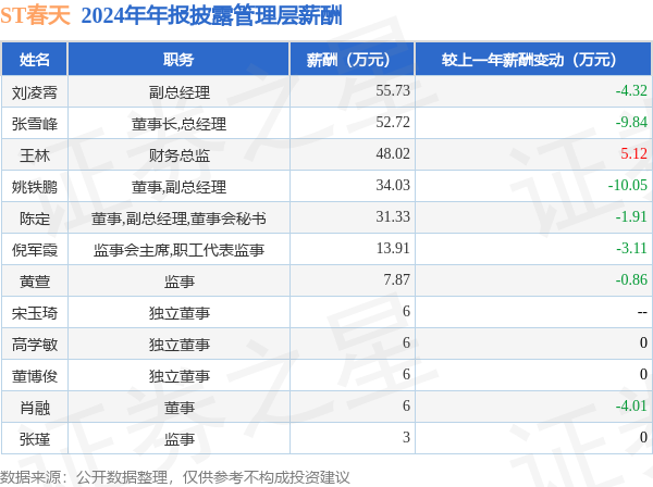 证券之星消息,ST春天发布2024年年报,数据显示:公司主营收入2.7亿元,同比增26.36%。归母净利润为-1.99亿元,同比增25.8%。扣非净利润为-1.62亿元,同比增33.69%。当年公司员工总数159人,同比减8.09%。人均薪酬15.86万元(注:"人均薪酬"根据定期报告中"应付职工薪酬"附注的本期增加值 / 员工总数计算而来),同比增2.35%。人均创收169.98万元,同比增37.49%。其中管理层薪酬总额为270.61万元,同比上一年减9.67%,薪酬最高的为副总经理刘凌霄,薪酬55.73万元。