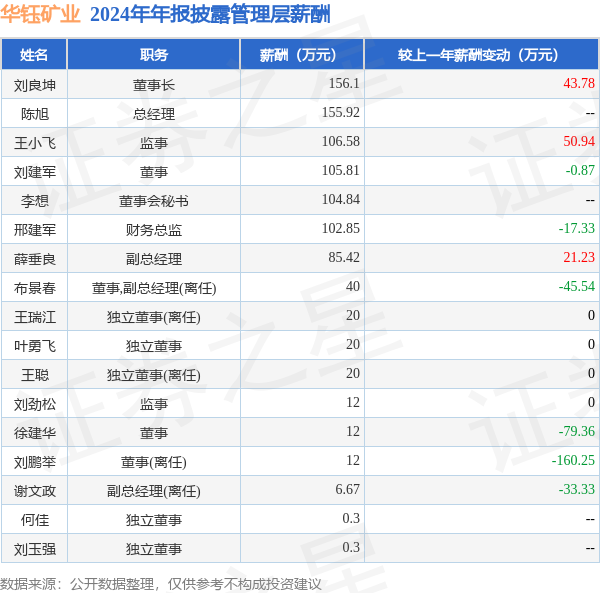 证券之星消息,华钰矿业发布2024年年报,数据显示:公司主营收入16.14亿元,同比增85.27%。归母净利润为2.53亿元,同比增242.85%。扣非净利润为2.53亿元,同比增247.98%。当年公司员工总数1672人,同比增28.42%。人均薪酬14.02万元(注:"人均薪酬"根据定期报告中"应付职工薪酬"附注的本期增加值 / 员工总数计算而来),同比增3.92%。人均创收96.52万元,同比增44.27%。人均创利22.75万元,同比增546.13%。其中管理层薪酬总额为960.79万元,同比上一年减8.18%,薪酬最高的为董事长刘良坤,薪酬156.1万元。