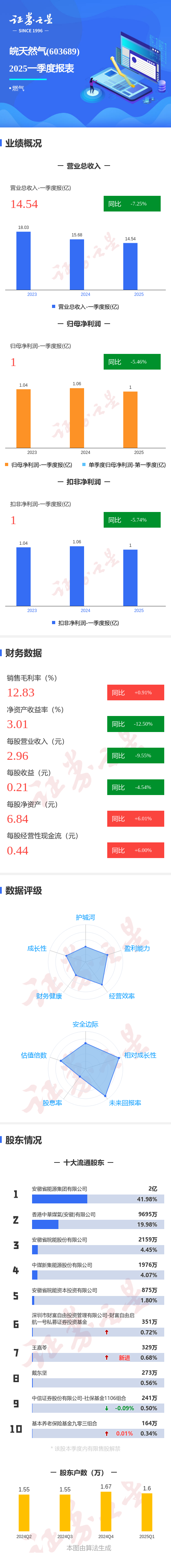 证券之星消息,皖天然气2025年一季报显示,公司主营收入14.54亿元,同比下降7.25%;归母净利润1.01亿元,同比下降5.47%;扣非净利润1.0亿元,同比下降5.75%;负债率47.62%,投资收益1104.72万元,财务费用1332.02万元,毛利率12.83%。