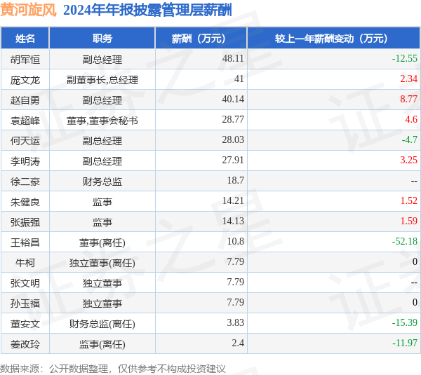 证券之星消息,黄河旋风发布2024年年报,数据显示:公司主营收入13.01亿元,同比减17.36%。归母净利润为-9.83亿元,同比减23.14%。扣非净利润为-9.99亿元,同比减24.73%。当年公司员工总数2043人,同比减2.16%。人均薪酬11.26万元(注:"人均薪酬"根据定期报告中"应付职工薪酬"附注的本期增加值 / 员工总数计算而来),同比减1.51%。人均创收63.69万元,同比减15.54%。其中管理层薪酬总额为301.4万元,同比上一年减34.26%,薪酬最高的为副总经理胡军恒,薪酬48.11万元。