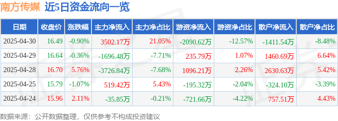 证券之星消息,截至2025年4月30日收盘,南方传媒(601900)报收于16.49元,下跌0.9%,换手率1.13%,成交量10.08万手,成交额1.66亿元。
