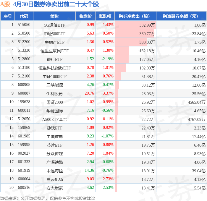 A股融券净卖出前三分别为:5G通信ETF(515050)融券净卖出382.99万股、中证500ETF(510500)融券净卖出360.77万股、房地产ETF(512200)融券净卖出300万股,前20具体见下表:
