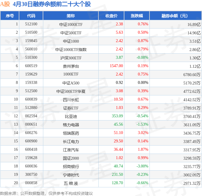 A股融券余额前三分别为:中证1000ETF(512100)融券余额16.89亿元、中证500ETF(510500)融券余额14.96亿元、中证1000(159845)融券余额3.51亿元,前20具体见下表: