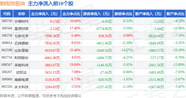 从资金流向上来看,当日钠电池板块主力资金净流入11.07亿元,游资资金净流出7.99亿元,散户资金净流出3.08亿元。钠电池板块个股资金流向见下表: