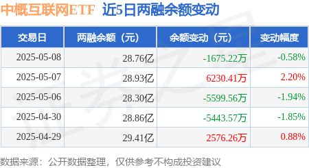 证券之星消息,5月8日,中概互联网ETF(513050)融资买入3.22亿元,融资偿还3.38亿元,融资净卖出1675.22万元,融资余额28.76亿元。