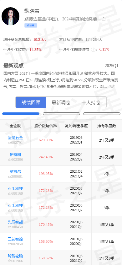 海信视像(600060)是基金经理魏晓雪的重仓股。,其在整个职业生涯内年化收益高达14.35%。魏晓雪的大佬持仓 - 战绩回顾截图如下: