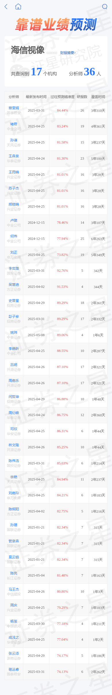 如果您对这家公司感兴趣,可以参考证星研究院统计的海信视像的分析师业绩预测数据,其中根据国泰君安的分析师蔡雯娟预测公司未来PE为11.0(更多特色估值数据尽在证星研究院,所有数据均来源公开资料,期且所有资料都存在一定时间滞后,所有相关数据均不可作为投资决策单一依据)。