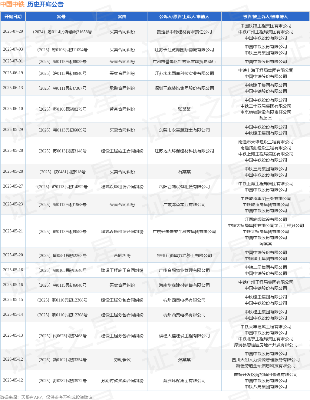 案号:(2025)浙0110民初12308号根据统计,近一年内以中国中铁股份有限公司为当事人的历史开庭公告有258则,其中案由为“买卖合同纠纷”的公告以113则居首,其次为“建设工程施工合同纠纷”有32则,“建设工程分包合同纠纷”有25则。历史开庭公告(前20条)如下: