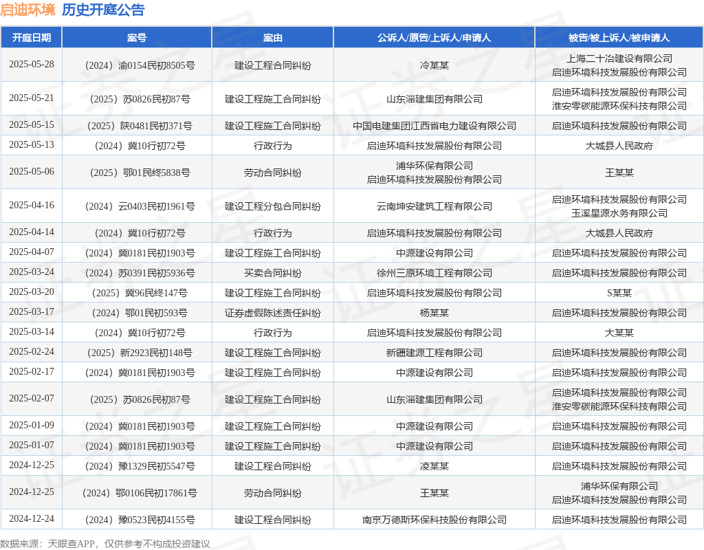 案号:(2025)陕0481民初371号根据统计,近一年内以启迪环境科技发展股份有限公司为当事人的历史开庭公告有66则,其中案由为“证券虚假陈述责任纠纷”的公告以25则居首,其次为“建设工程施工合同纠纷”有21则,“建设工程合同纠纷”有8则。历史开庭公告(前20条)如下: