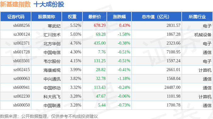 证券之星消息,5月13日,新基建(980029)指数报收于4806.74点,跌0.34%,成交584.47亿元,换手率0.66%。当日该指数成份股中,上涨的有11家,新易盛以2.69%的涨幅领涨,下跌的有39家,中国卫通以3.12%的跌幅领跌。