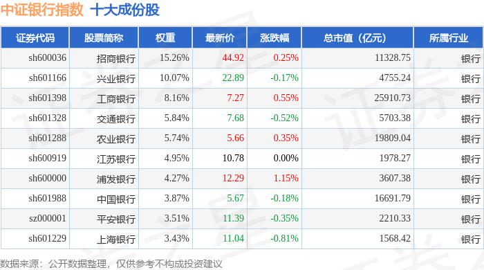 证券之星消息,5月15日,中证银行(399986)指数报收于7682.74点,跌0.11%,成交258.95亿元,换手率0.26%。当日该指数成份股中,上涨的有8家,浦发银行以1.15%的涨幅领涨,下跌的有30家,民生银行以1.19%的跌幅领跌。