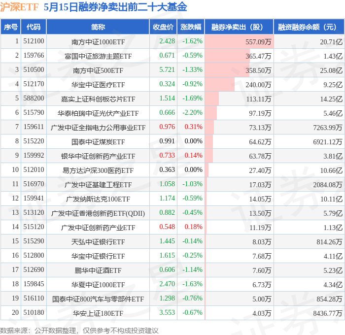 沪深ETF融券净卖出前三分别为:南方中证1000ETF(512100)融券净卖出557.09万股、富国中证旅游主题ETF(159766)融券净卖出365.47万股、南方中证500ETF(510500)融券净卖出358.5万股,前20具体见下表: