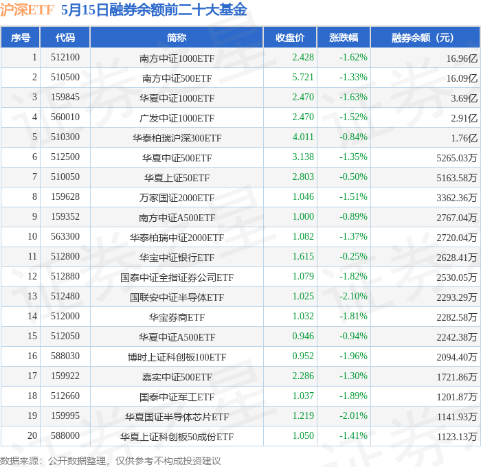 沪深ETF融券余额前三分别为:南方中证1000ETF(512100)融券余额16.96亿元、南方中证500ETF(510500)融券余额16.09亿元、华夏中证1000ETF(159845)融券余额3.69亿元,前20具体见下表: