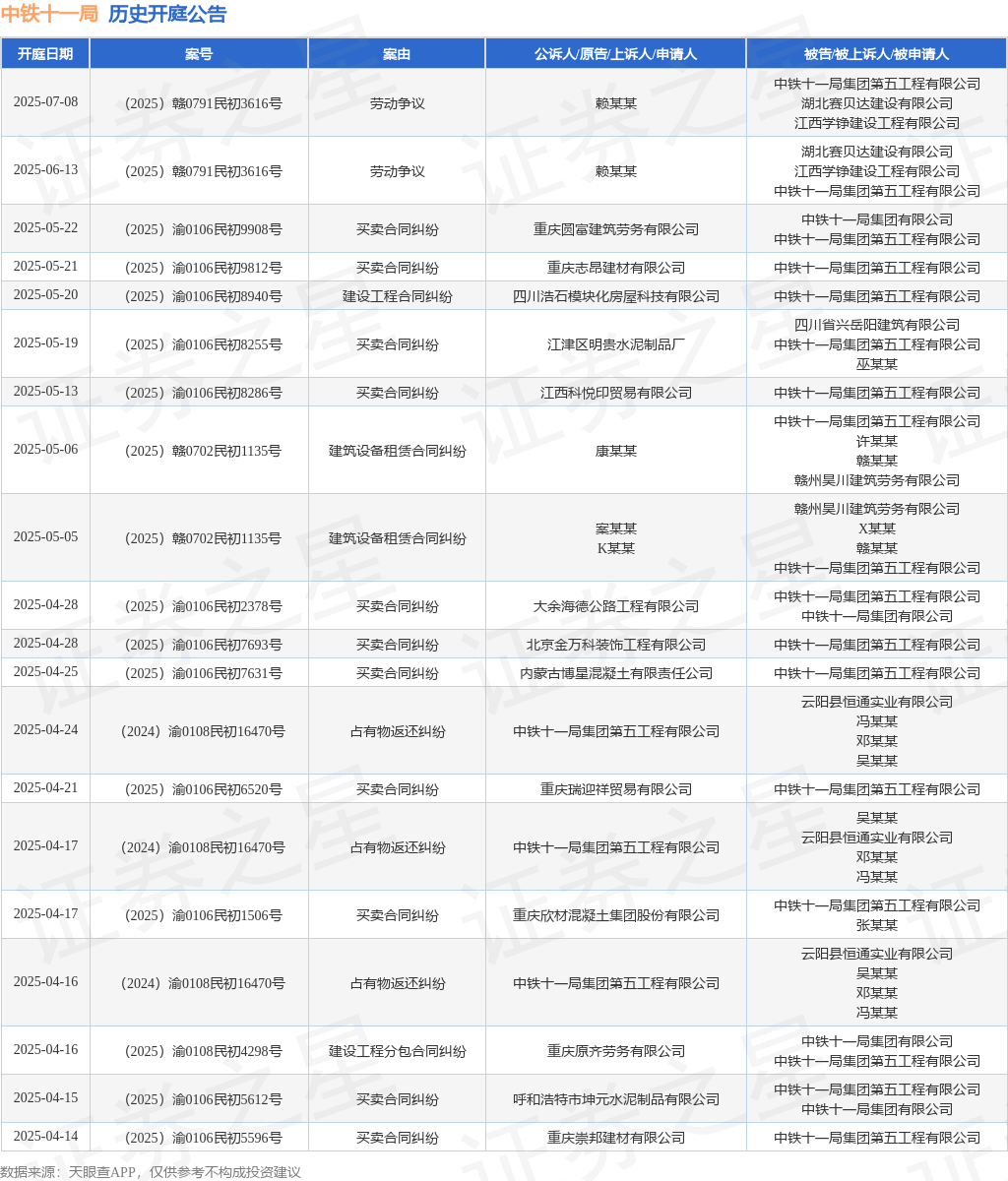 案号:(2025)渝0106民初9812号根据统计,近一年内以中铁十一局集团第五工程有限公司为当事人的历史开庭公告有169则,其中案由为“买卖合同纠纷”的公告以74则居首,其次为“劳务合同纠纷”有20则,“建设工程分包合同纠纷”有11则。历史开庭公告(前20条)如下: