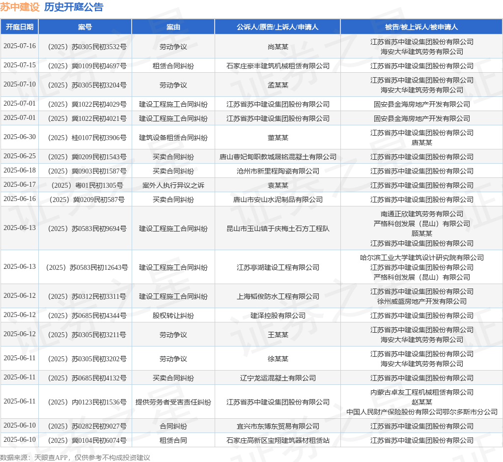 案号:(2024)苏0602民初13783号根据统计,近一年内以江苏省苏中建设集团股份有限公司为当事人的历史开庭公告有1319则,其中案由为“买卖合同纠纷”的公告以348则居首,其次为“建设工程施工合同纠纷”有179则,“建设工程分包合同纠纷”有105则。历史开庭公告(前20条)如下: