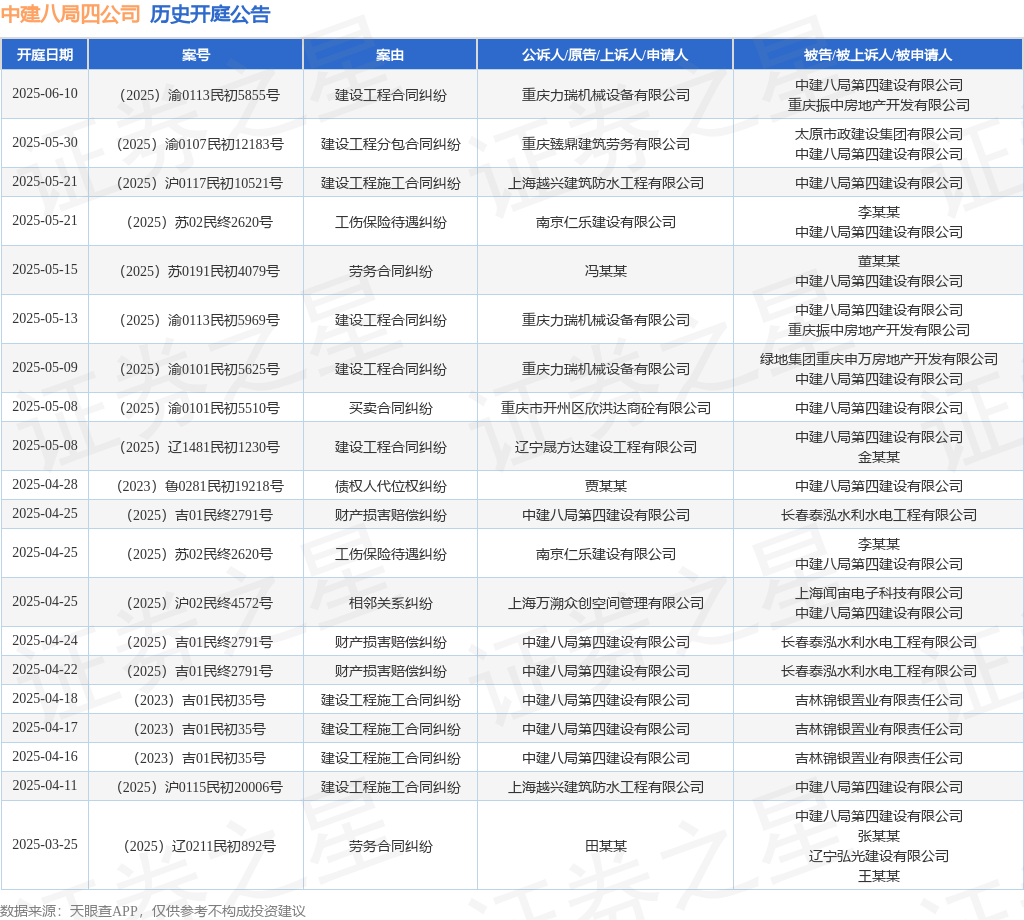 案号:(2025)沪0117民初10521号根据统计,近一年内以中建八局第四建设有限公司为当事人的历史开庭公告有104则,其中案由为“建设工程施工合同纠纷”的公告以26则居首,其次为“建设工程合同纠纷”有20则,“劳务合同纠纷”有11则。历史开庭公告(前20条)如下: