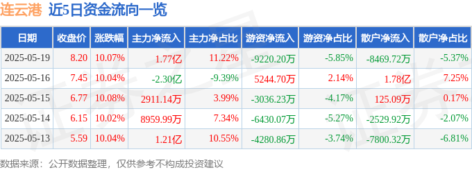 证券之星消息,连云港5月19日涨停收盘,收盘价8.2元。该股于9点37分涨停,1次打开涨停,截止收盘封单资金为9405.14万元,占其流通市值0.92%。
