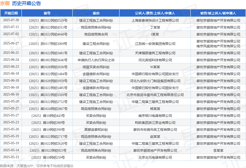 证券之星消息,根据天眼查APP显示,近日公布了一则廊坊京御房地产开发有限公司作为被告/被上诉人的开庭公告,详细内容如下: