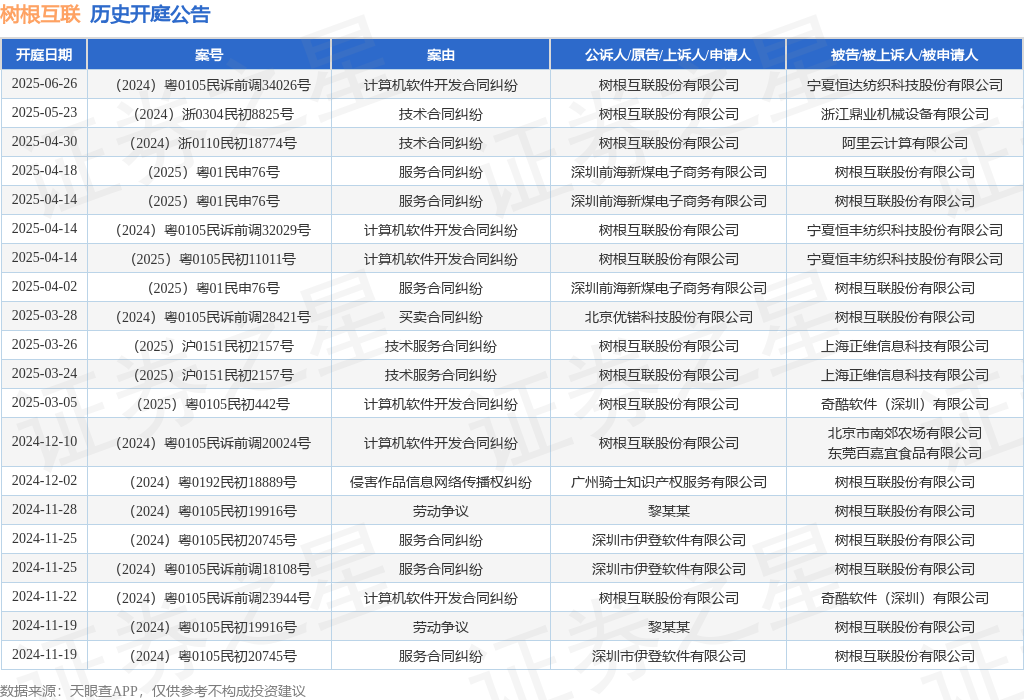 案号:(2024)浙0304民初8825号根据统计,近一年内以树根互联股份有限公司为当事人的历史开庭公告有31则,其中案由为“计算机软件开发合同纠纷”的公告以10则居首,其次为“服务合同纠纷”有8则,“劳动争议”有4则。历史开庭公告(前20条)如下: