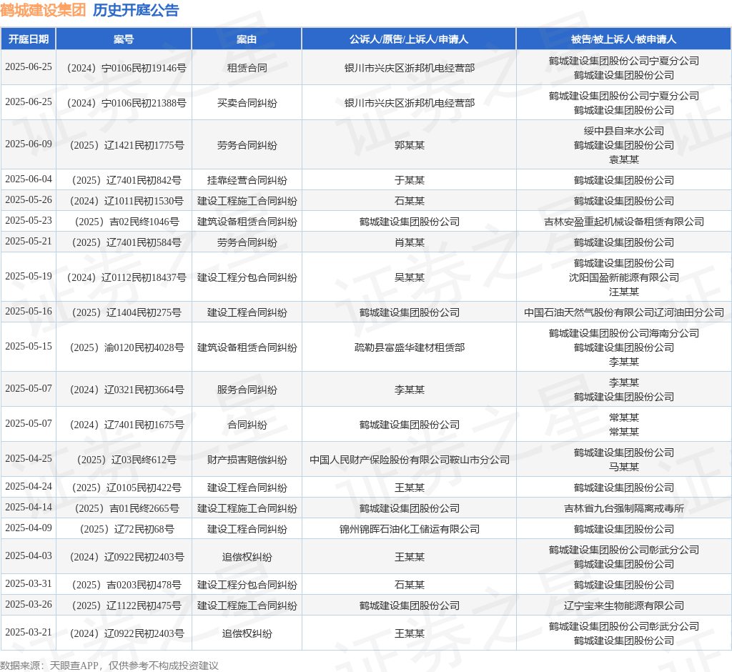 案号:(2025)吉02民终1046号根据统计,近一年内以鹤城建设集团股份公司为当事人的历史开庭公告有121则,其中案由为“建设工程施工合同纠纷”的公告以40则居首,其次为“买卖合同纠纷”有18则,“劳务合同纠纷”有10则。历史开庭公告(前20条)如下: