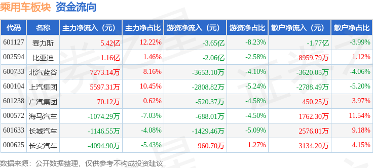 从资金流向上来看,当日乘用车板块主力资金净流入7.24亿元,游资资金净流出6.52亿元,散户资金净流出7198.34万元。乘用车板块个股资金流向见下表: