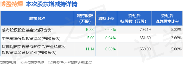 证券之星消息,5月22日博盈特焊发布公告《博盈特焊:关于持股5%以上股东减持股份到5%以下并触及1%整数倍暨权益变动的提示性公告》,其股东前海股权投资基金(有限合伙)、中原前海股权投资基金(有限合伙)、深圳润信新观象战略新兴产业私募股权投资基金合伙企业(有限合伙)于2025年5月22日合计减持26.14万股,占公司目前总股本的0.1981%,变动期间该股股价下跌1.57%,截止5月22日收盘报21.98元。