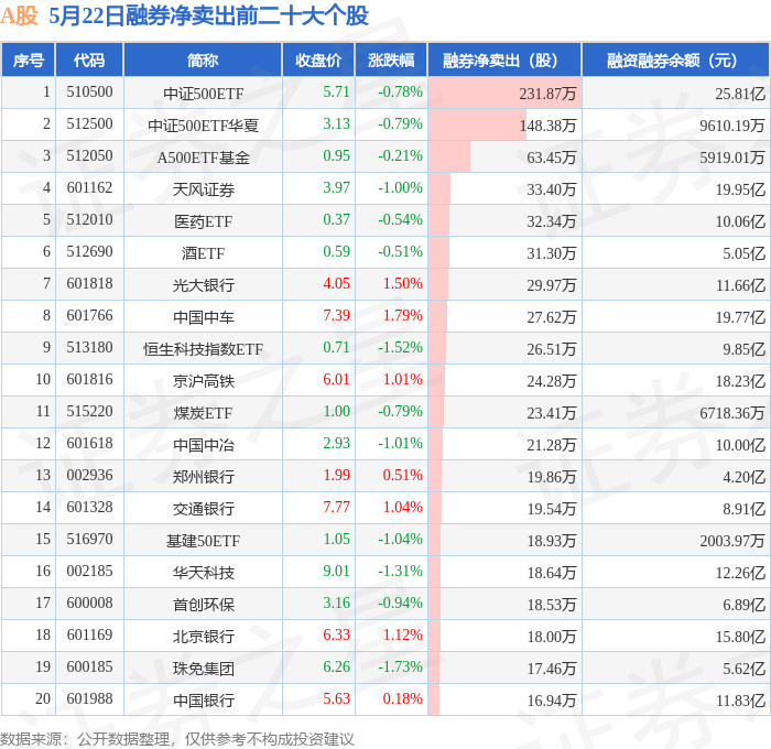 A股融券净卖出前三分别为:中证500ETF(510500)融券净卖出231.87万股、中证500ETF华夏(512500)融券净卖出148.38万股、A500ETF基金(512050)融券净卖出63.45万股,前20具体见下表: