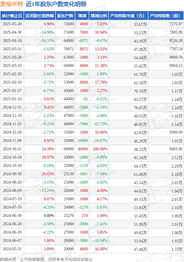 从股价来看,2025年4月30日至2025年5月20日,麦格米特区间涨幅为6.98%,在此期间股东户数增加4000.0户,增幅为5.63%。