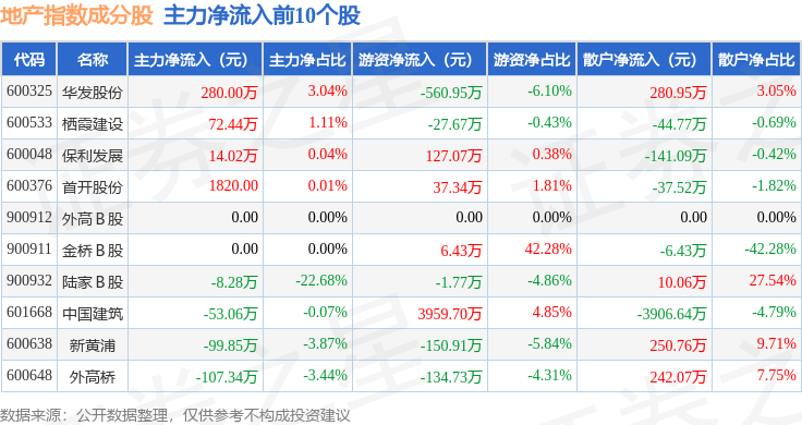 资金流向方面,地产指数(000006)成份股当日主力资金净流出合计1.25亿元,游资资金净流入合计7900.97万元,散户资金净流入合计4638.6万元。成份股资金流向详情见下表: