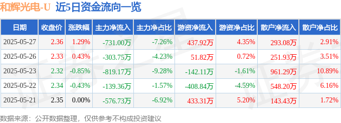 证券之星消息,截至2025年5月27日收盘,和辉光电(688538)报收于2.36元,上涨1.29%,换手率0.74%,成交量42.78万手,成交额1.01亿元。