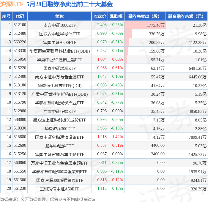 沪深ETF融券净卖出前三分别为:南方中证1000ETF(512100)融券净卖出1775.46万股、国联安中证半导体ETF(512480)融券净卖出336.56万股、富国中证A500ETF(563220)融券净卖出200.89万股,前20具体见下表: