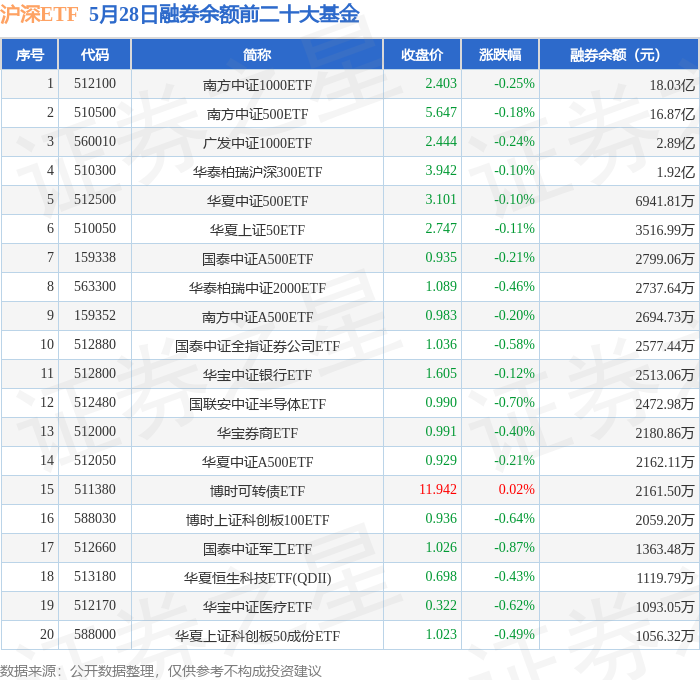 沪深ETF融券余额前三分别为:南方中证1000ETF(512100)融券余额18.03亿元、南方中证500ETF(510500)融券余额16.87亿元、广发中证1000ETF(560010)融券余额2.89亿元,前20具体见下表: