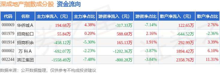资金流向方面,深成地产(971001)指数成份股当日主力资金净流出合计2458.15万元,游资资金净流出合计1566.15万元,散户资金净流入合计4024.3万元。成份股资金流向详情见下表: