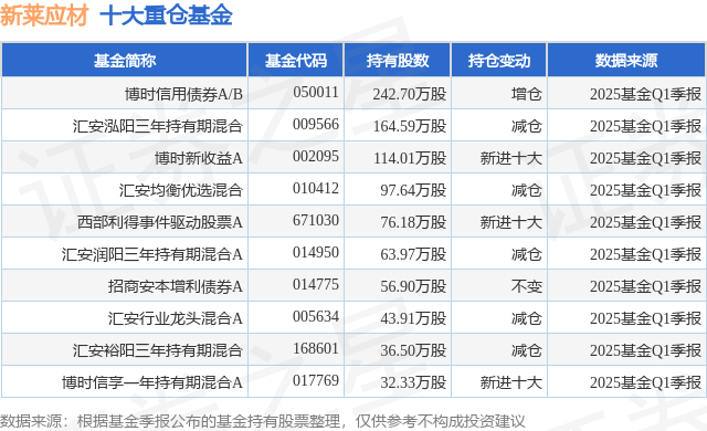 根据2025基金Q1季报公募基金重仓股数据,重仓该股的公募基金共15家,其中持有数量最多的公募基金为博时基金的博时信用债券A/B。博时信用债券A/B目前规模为48.58亿元,最新净值3.2146(5月29日),较上一交易日上涨0.35%,近一年上涨2.67%。该公募基金现任基金经理为过钧。过钧在任的基金产品包括:博时新收益A,管理时间为2016年2月29日至今,期间收益率为101.62%;博时双季鑫6个月持有混合A,管理时间为2021年1月20日至今,期间收益率为3.68%;博时浦惠一年持有期混合A,管理时间为2022年2月17日至今,期间收益率为-7.73%。