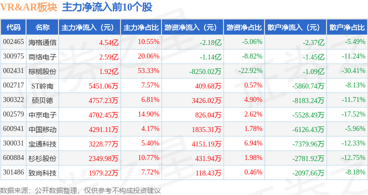 从资金流向上来看,当日VR&AR板块主力资金净流出30.37亿元,游资资金净流入10.04亿元,散户资金净流入20.32亿元。VR&AR板块个股资金流向见下表: