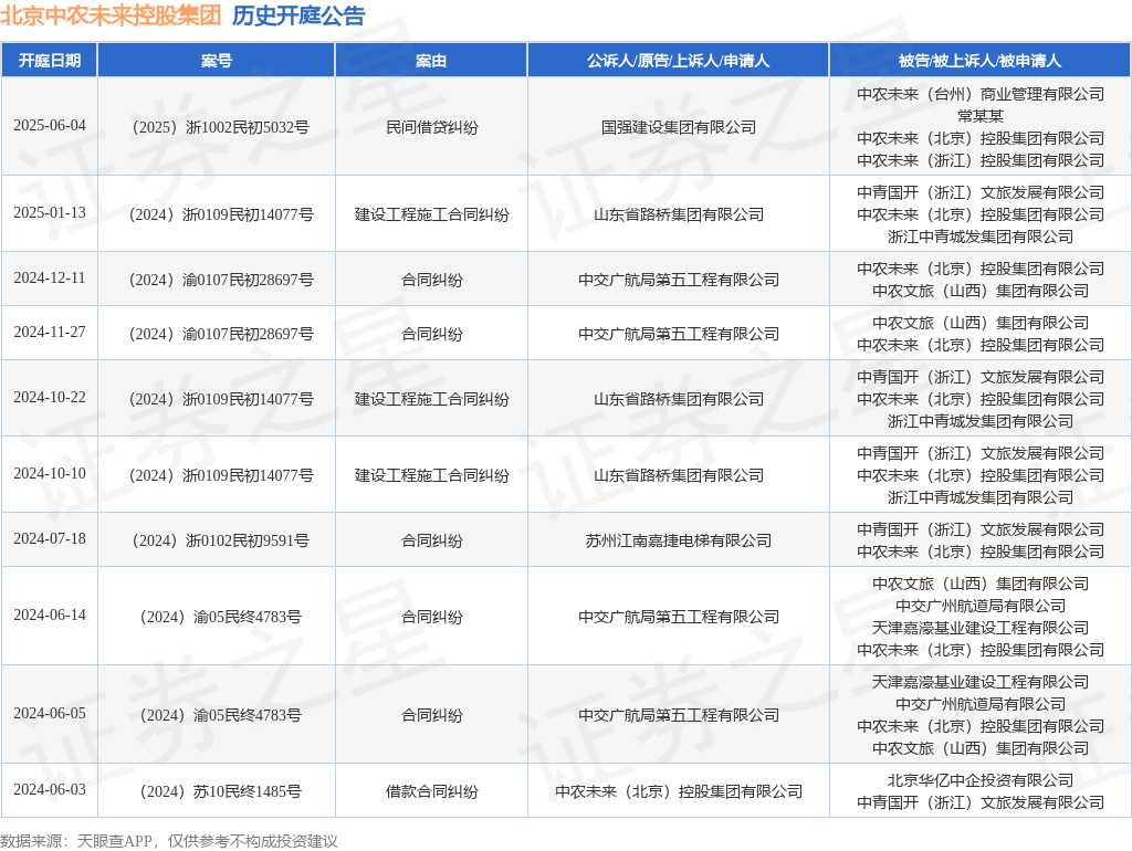 案号:(2025)浙1002民初5032号根据统计,近一年内以中农未来(北京)控股集团有限公司为当事人的历史开庭公告有10则,其中案由为“合同纠纷”的公告以5则居首,其次为“建设工程施工合同纠纷”有3则,“借款合同纠纷”有1则。历史开庭公告如下: