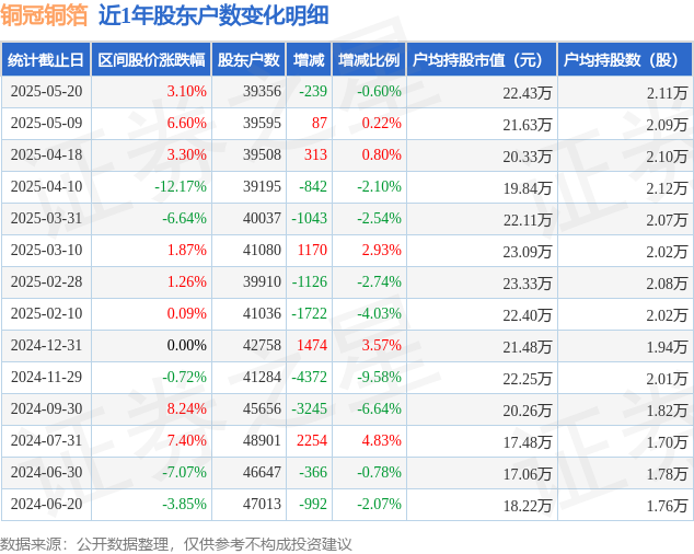 证券之星消息,近日铜冠铜箔披露,截至2025年5月20日公司股东户数为3.94万户,较5月9日减少239.0户,减幅为0.6%。户均持股数量由上期的2.09万股增加至2.11万股,户均持股市值为22.43万元。