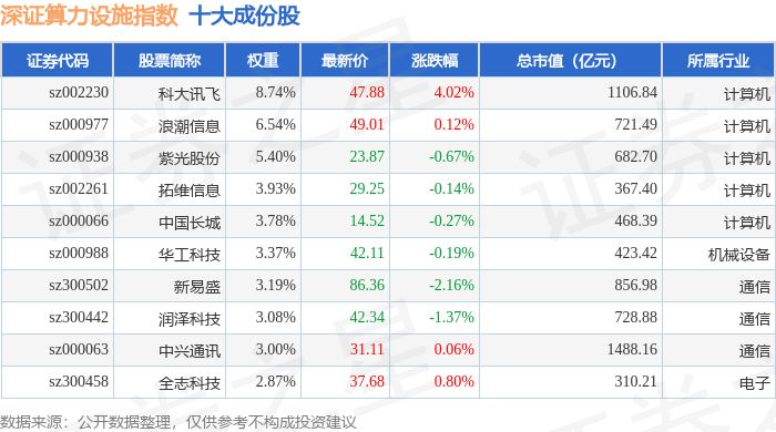 证券之星消息,6月3日,深证算力设施(970051)指数报收于7620.22点,涨0.06%,成交263.36亿元,换手率1.62%。当日该指数成份股中,上涨的有21家,科大讯飞以4.02%的涨幅领涨,下跌的有27家,数字政通以2.77%的跌幅领跌。