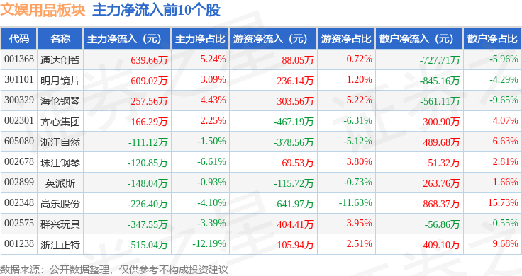 从资金流向上来看,当日文娱用品板块主力资金净流出4.15亿元,游资资金净流出5157.89万元,散户资金净流入4.66亿元。文娱用品板块个股资金流向见下表: