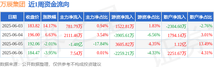 资金流向数据方面,本周万辰集团主力资金合计净流出1.19亿元,游资资金合计净流出1036.18万元,散户资金合计净流入1.29亿元。本周资金流向一览见下表: