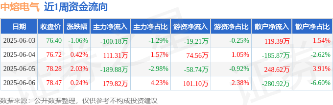 资金流向数据方面,本周中熔电气主力资金合计净流入1.07万元,游资资金合计净流入97.71万元,散户资金合计净流出98.78万元。本周资金流向一览见下表: