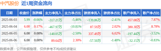 沪深股通持股方面,截止2025年6月6日收盘,中汽股份深股通持股数为44.23万股,占流通股比为6.0%。