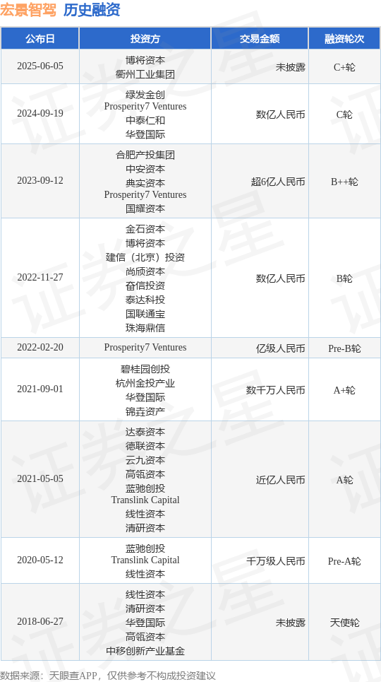 证券之星消息,根据天眼查APP于6月5日公布的信息整理,宏景智驾(衢州)科技有限公司C+轮融资,融资额未披露,参与投资的机构包括博将资本,衢州工业集团。
