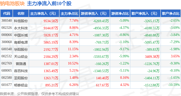 从资金流向上来看,当日钠电池板块主力资金净流出10.31亿元,游资资金净流入2.69亿元,散户资金净流入7.62亿元。钠电池板块个股资金流向见下表:
